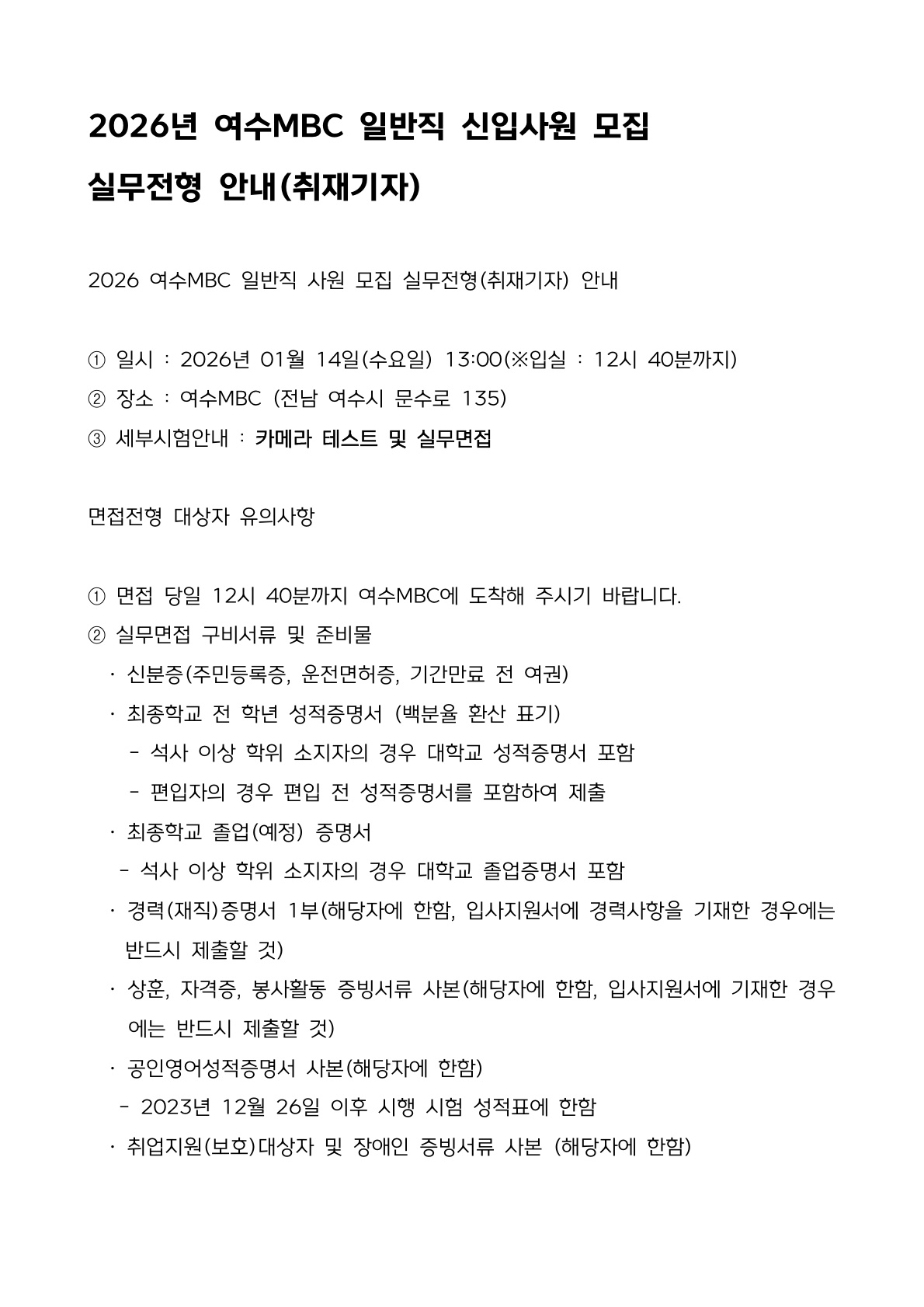 2026년 여수MBC 일반직 사원 모집 실무전형(3차) 안내(취재기자)