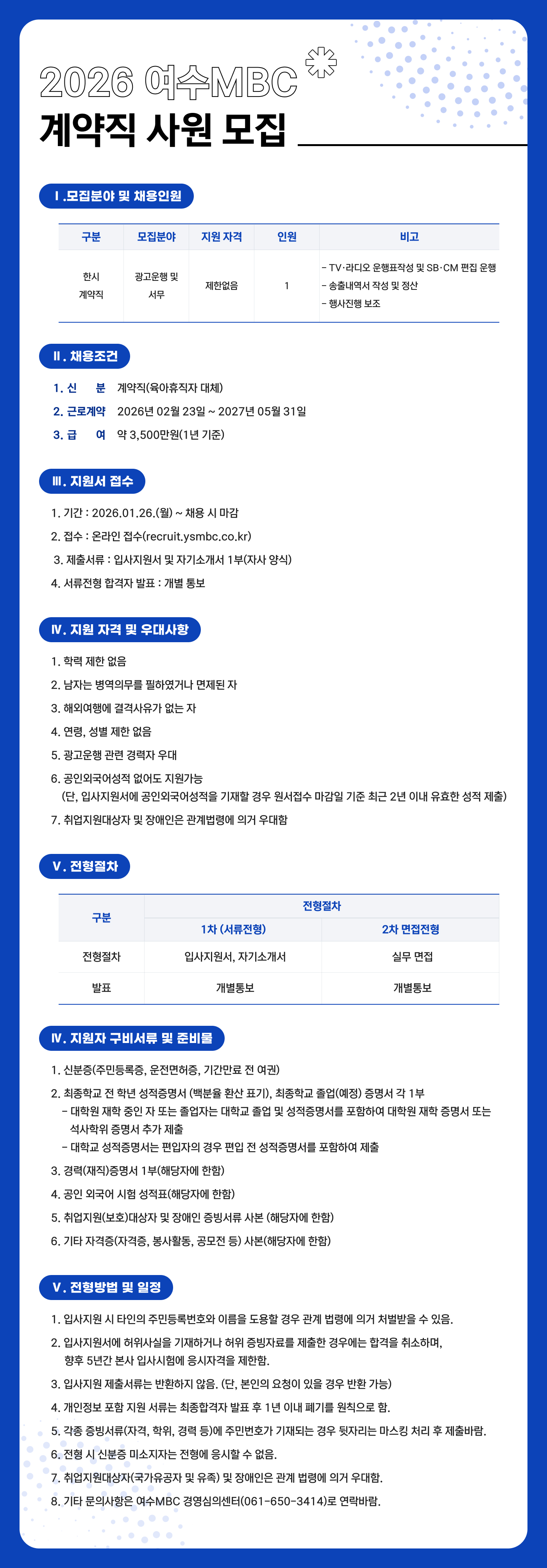 채용공고 광고운행 및 서무 2026년 여수MBC 한시계약직 사원 모집(광고운행 및 서무) 모집부문 : 광고운행 및 서무 지원서 접수기간 : 2026-01-26 00:00 ~ 2026-02-22 23:59 합격자 발표 : 2026-02-22 14:00 공고내용 지원하기 목록